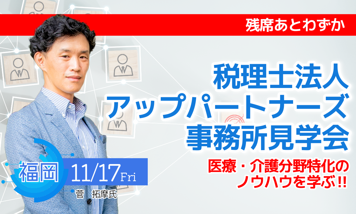 アップパートナーズグループ(本部:福岡県福岡市)は、税理士法人アップパートナーズを中核とするコンサルティングファームです。税理士法人のほか、社会保険労務士法人かぜよみ、司法書士法人ハート・トラストなど計8社で構成されており、福岡、佐賀、長崎を中心に7拠点を展開。クライアント数2500件、スタッフ数320名(2023年8月現在)に上る、西日本最大級の超大型会計グループに成長を遂げています。 今回の見学会では、同グループ代表で税理士法人アップパートナーズの代表税理士である菅 拓摩先生をはじめ、社会保険労務士法人の代表社労士、現場の担当者に、近年の取り組みやコロナ禍への対応、今後の成長戦略についてお話しいただきます。